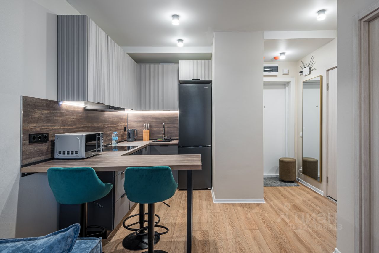 Кухня-гостиная оснащена всей необходимой техникой: варочной панелью, духовым шкафом, холодильником, чайником, посудой и обеденной зоной. Всё продумано для удобства как в краткосрочных поездках, так и при более длительном проживании.