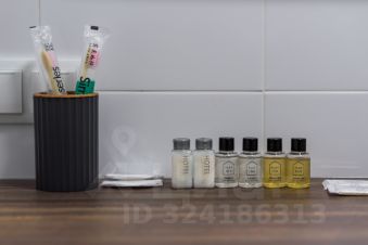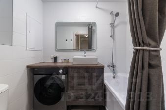 В ванной комнате — современная сантехника, душевая зона, стиральная машина, фен и фирменные косметические наборы Flat Inn.