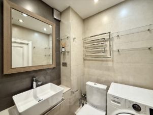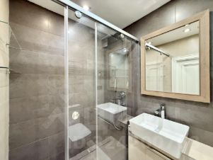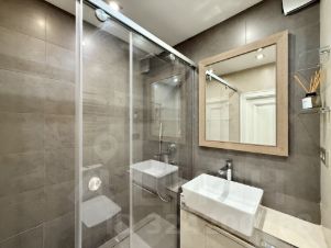 В квартире есть всё необходимое для комфортной жизни: современная мебель на кухне и в комнатах, а также полный набор бытовой техники — кондиционер, холодильник, посудомоечная и стиральная машины, телевизор. Санузел совмещённый, в ванной установлена душевая кабина. На лоджии можно устроить зону отдыха или использовать её для хранения.