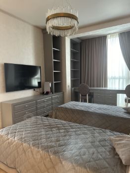 Апартаменты выполнены с дизайнерским ремонтом и полностью готовы для комфортного проживания. В квартире есть вся необходимая мебель: современная кухня и уютные комнаты. Для удобства проживания установлена бытовая техника: кондиционер, холодильник, посудомоечная машина, телевизор и стиральная машина. Планировка продумана до мелочей, чтобы вы могли чувствовать себя максимально комфортно.