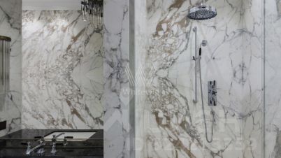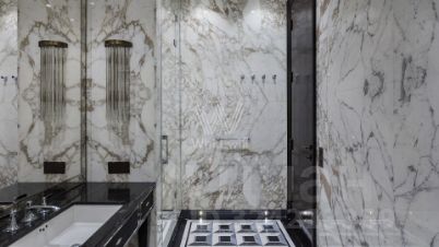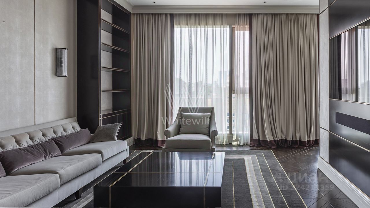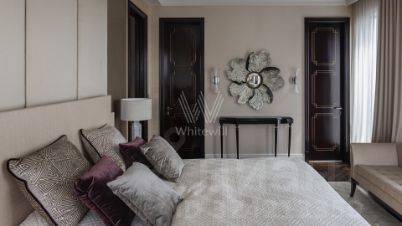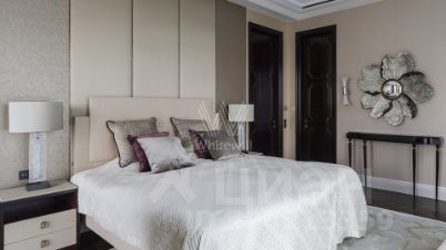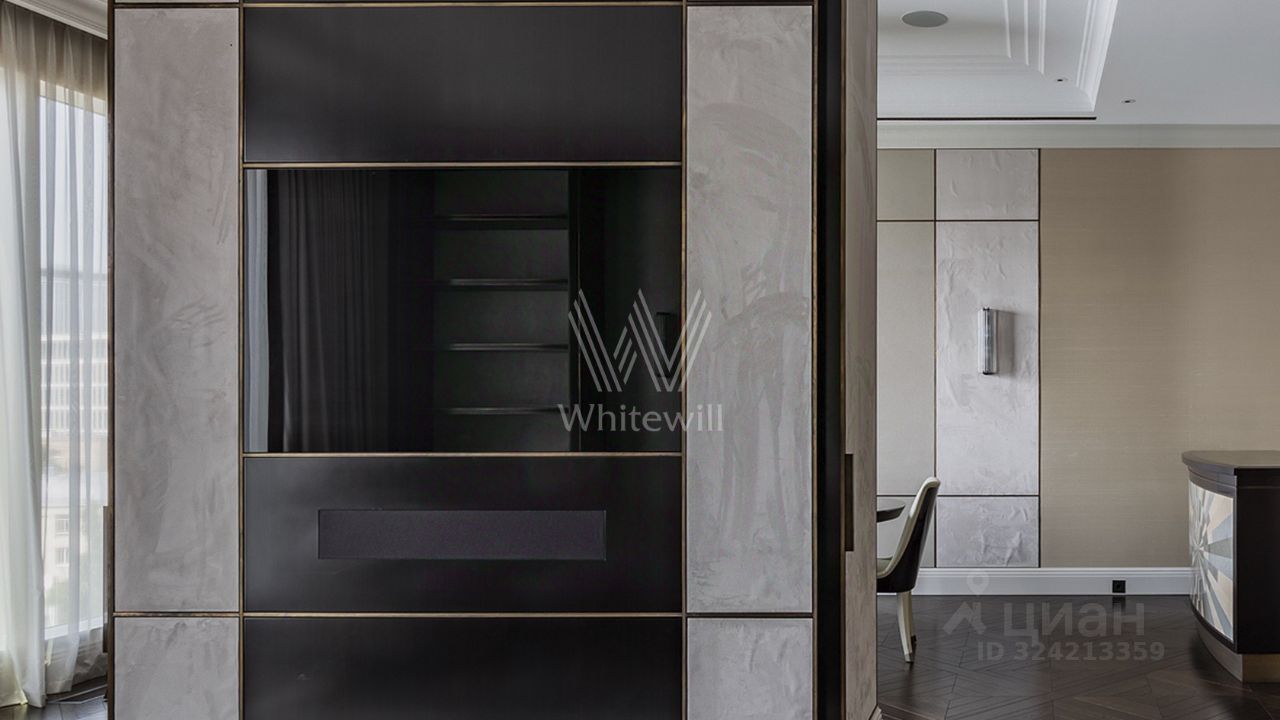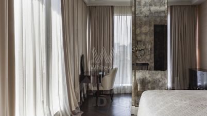 Просторная квартира с тремя спальнями в комплексе премиум-класса "Четыре ветра" в Тверском районе. Квартира площадью 186 м² расположена на девятом этаже. Интерьер оформлен в современном стиле в лаконичных тёплых тонах, в отделке использован натуральный мрамор, ценные породы дерева, шелк, кожа ската.