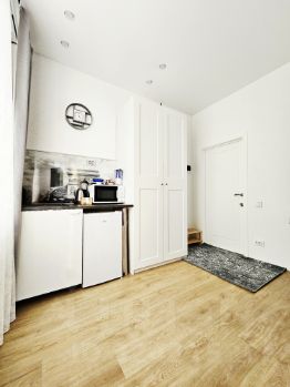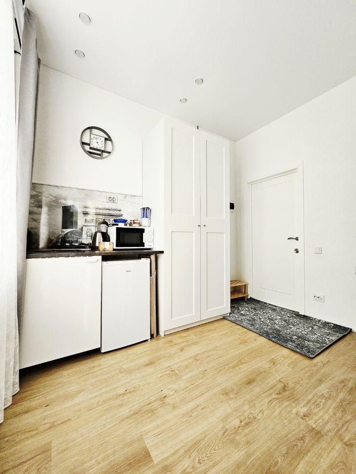 В комнате чайник, микроволновка, фен. Совмещенный санузел со стиральной машиной.