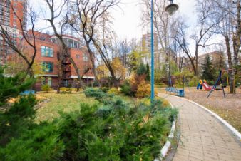 Дом расположен на закрытой территории, на которой также расположена открытая парковка, детская площадка, спортивная площадка с покрытием (зимой заливается каток, летом пляжный волейбол), собственный сквер с прогулочной зоной. Территория круглосуточной охраняется. В соседних домах расположены детский сад, Курчатовская школа и музыкальная школа им.Шнитке.