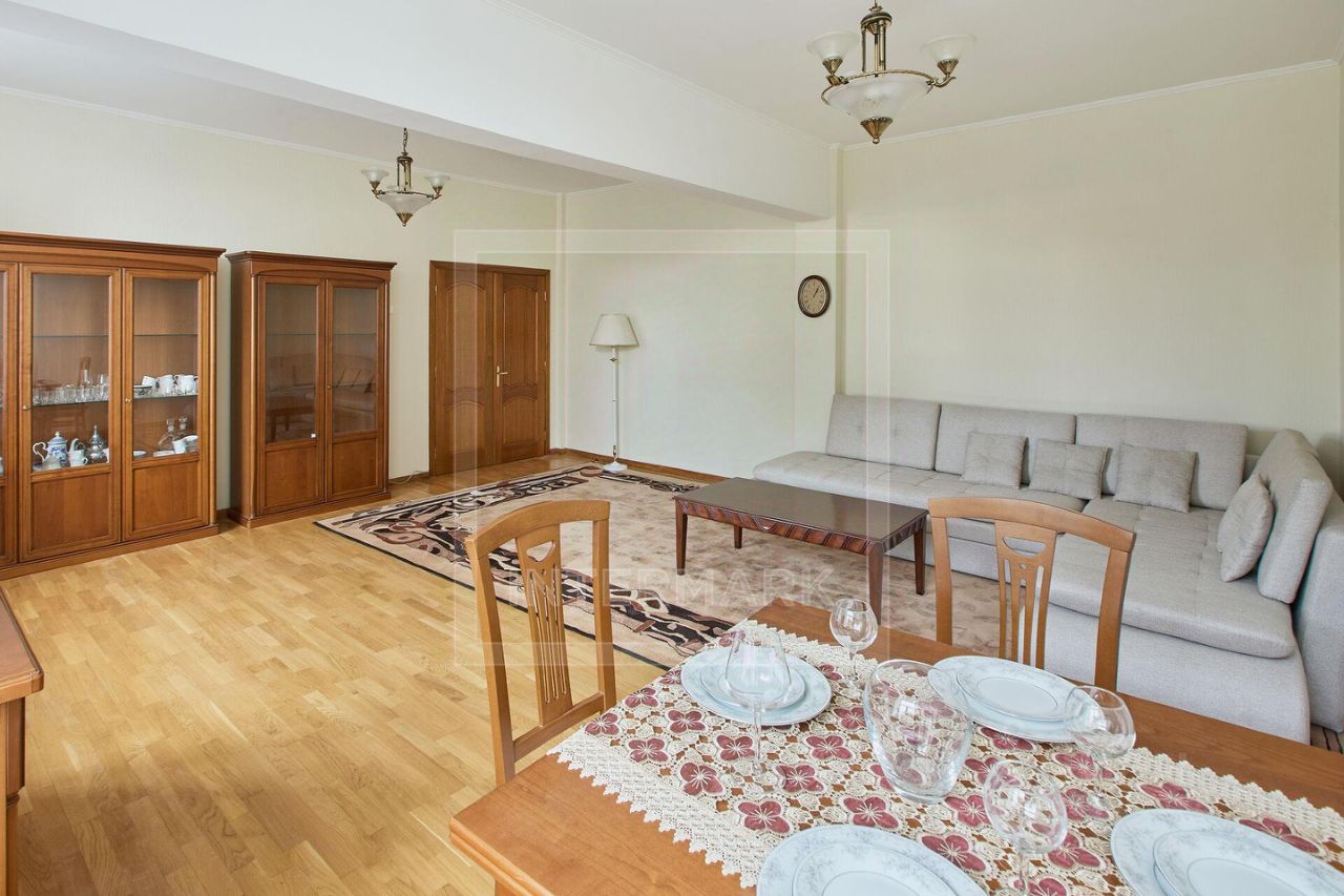 ID 13721: Предлагается 3-х комнатная квартира в сталинском доме с видами на гостиницу "Украина". Пространство грамотно зонировано. Выполнен косметический современный ремонт, полностью меблирована. Функциональная планировка: общая площадь 112 кв. м, гостиная-столовая c большим угловым диваном, изолированная кухня, большая и светлая спальня, кабинет, ванная комната, гардеробная. Кухня укомплектована качественной встроенной бытовой техникой британского бренда Jackys и надежными смесителями Blanco. В ванной комнате установлена немецкая сантехника Grohe. Высокие потолки 3 м. Квартира укомплектована кондиционером, посудомоечной машиной, бытовой техникой, домофоном. Открываются уникальные виды на одну из самых узнаваемых сталинских высоток гостиницу "Украина". В шаговой доступности расположена вся необходимая инфраструктура. Отличная транспортная доступность. Без домашних питомцев.
