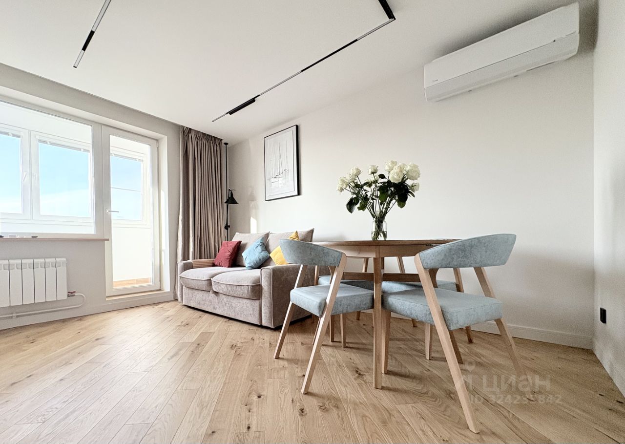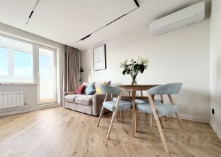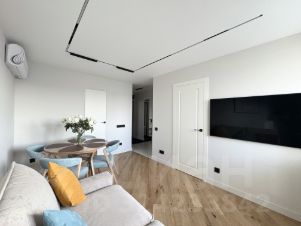 Гостинная-столовая: смарт-телевизор, шторы с подсветкой и с электроприводом, кондиционер, раскладной диван, раздвижной стол, очень удобные стулья, три сценария освещения.