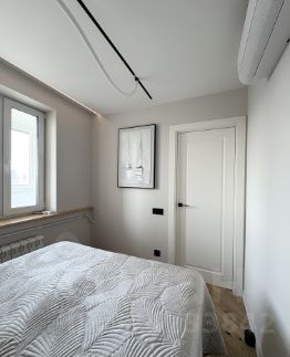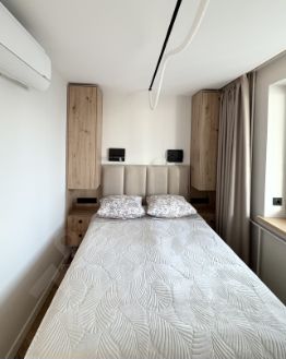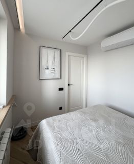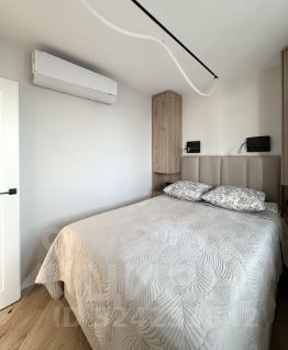 Спальня: кондиционер, шторы с подсветкой и электроприводом, высокая кровать с ящиком для хранения и с подсветкой.