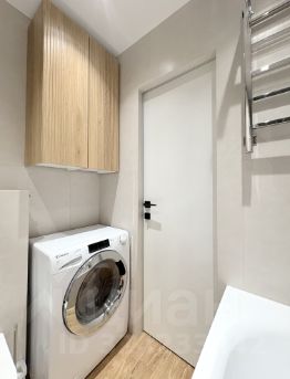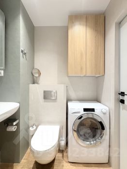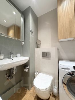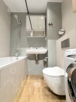 Ванная: стиральная машина с функцией сушки, подвесной унитаз, шкаф-зеркало с подсветкой, подсветка пола с датчиком движения.