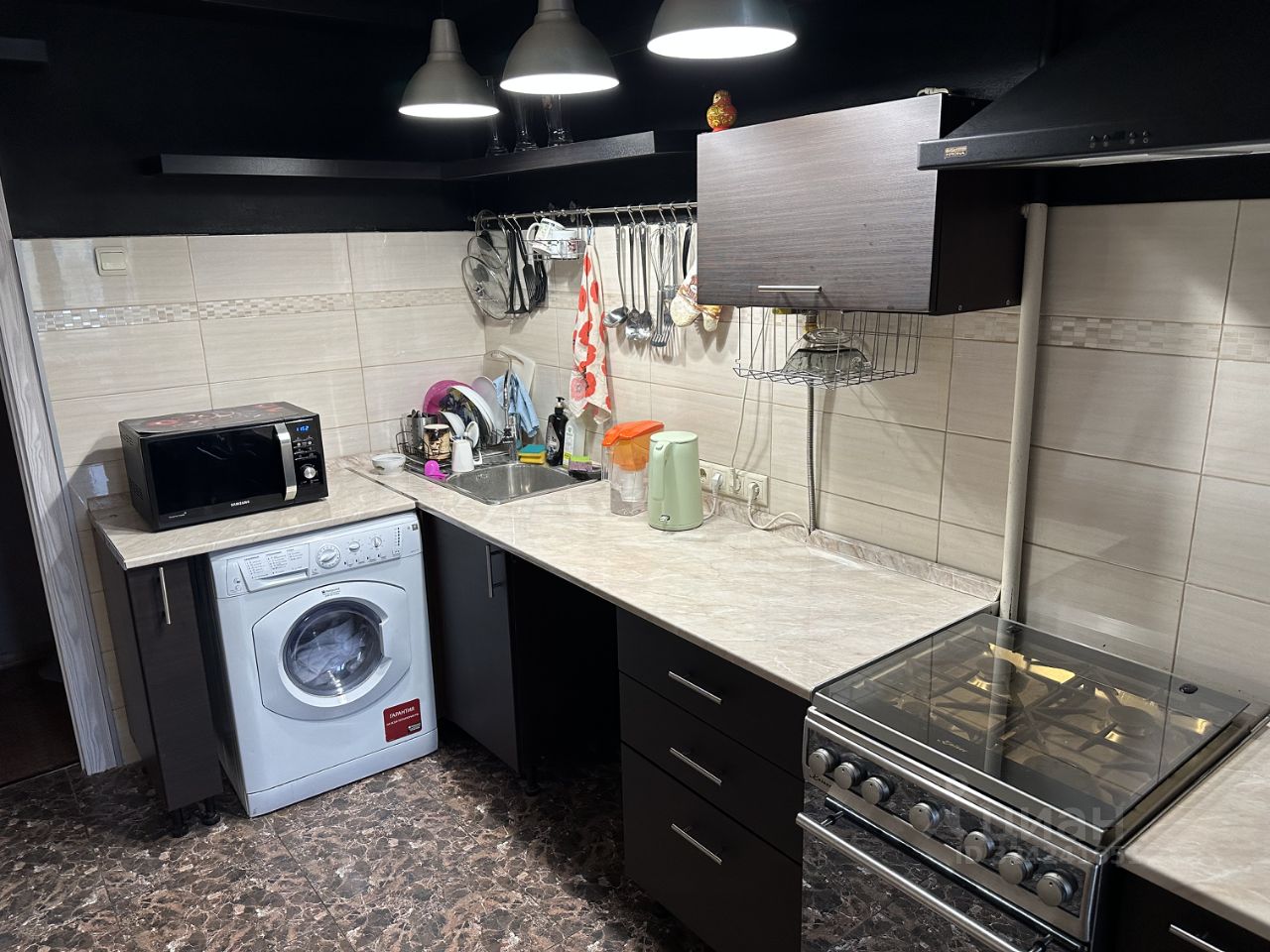 Большая кухня, раздельный санузел. В квартире имеется вся необходимая техника: кондиционер, новый холодильник, стиральная машина, газовая плита, телевизор, микроволновая печь.