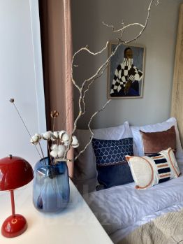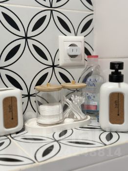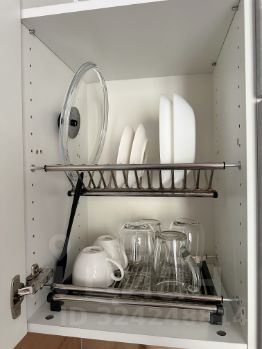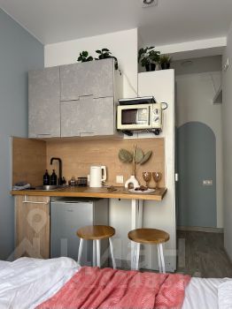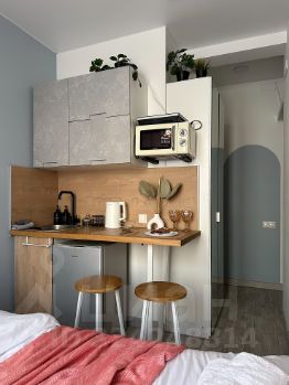 В студии есть мини-кухня, холодильник, микроволновка, плита, чайник, посуда, фен, утюг, полотенца, постельное белье, душевая система с тропическим душем. Кровать с ортопедическим матрасом. Стиральная машина в общем коридоре.