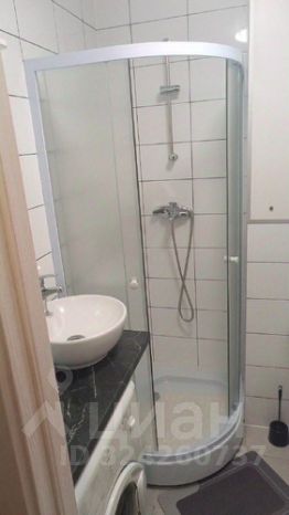 Совмещенный санузел оборудован душевой кабиной со стеклянной ширмой, раковиной со столешницей и стиральной машиной, а также навесной полочкой с зеркалом, тумбочкой и полотенцесушителем.