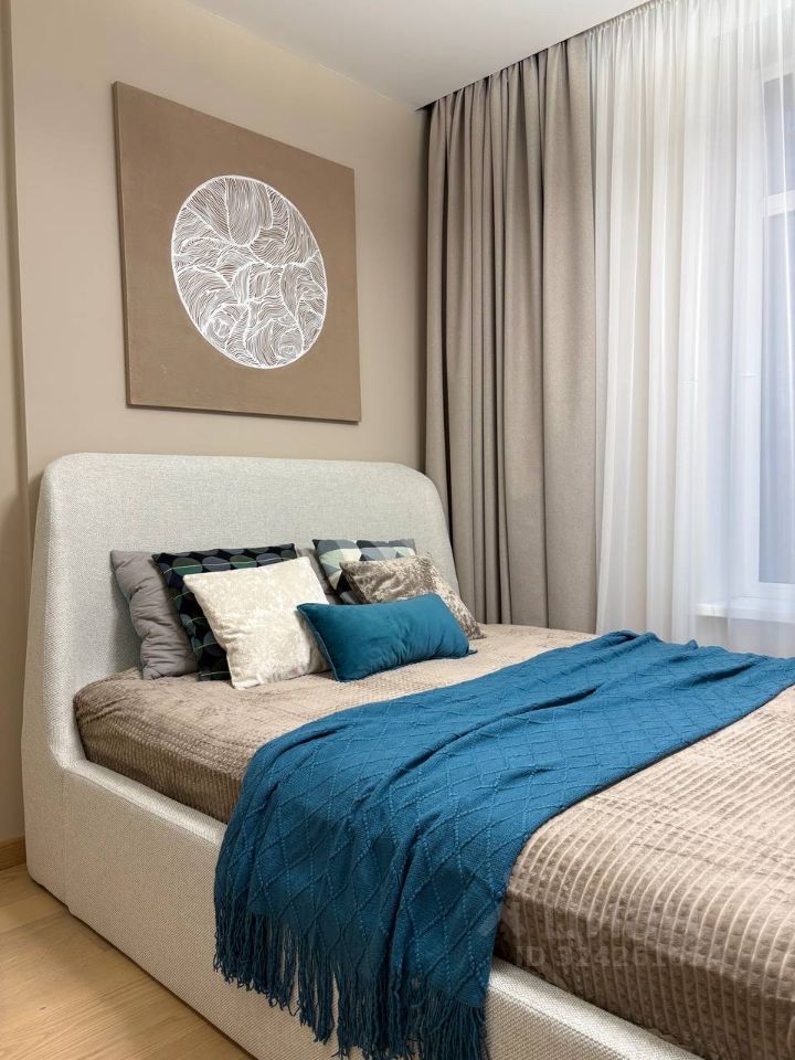 Квартира полностью укомплектована мебелью и техникой (кровать 160х200 с ортопедическим матрасом, телевизор 55 , холодильник, индукционная плита, духовка, посудомойка, стиральная машина, кондиционер). Много мест хранения, просторный совмещенный санузел с большой ванной, окно выходит в тихий и красивый двор.