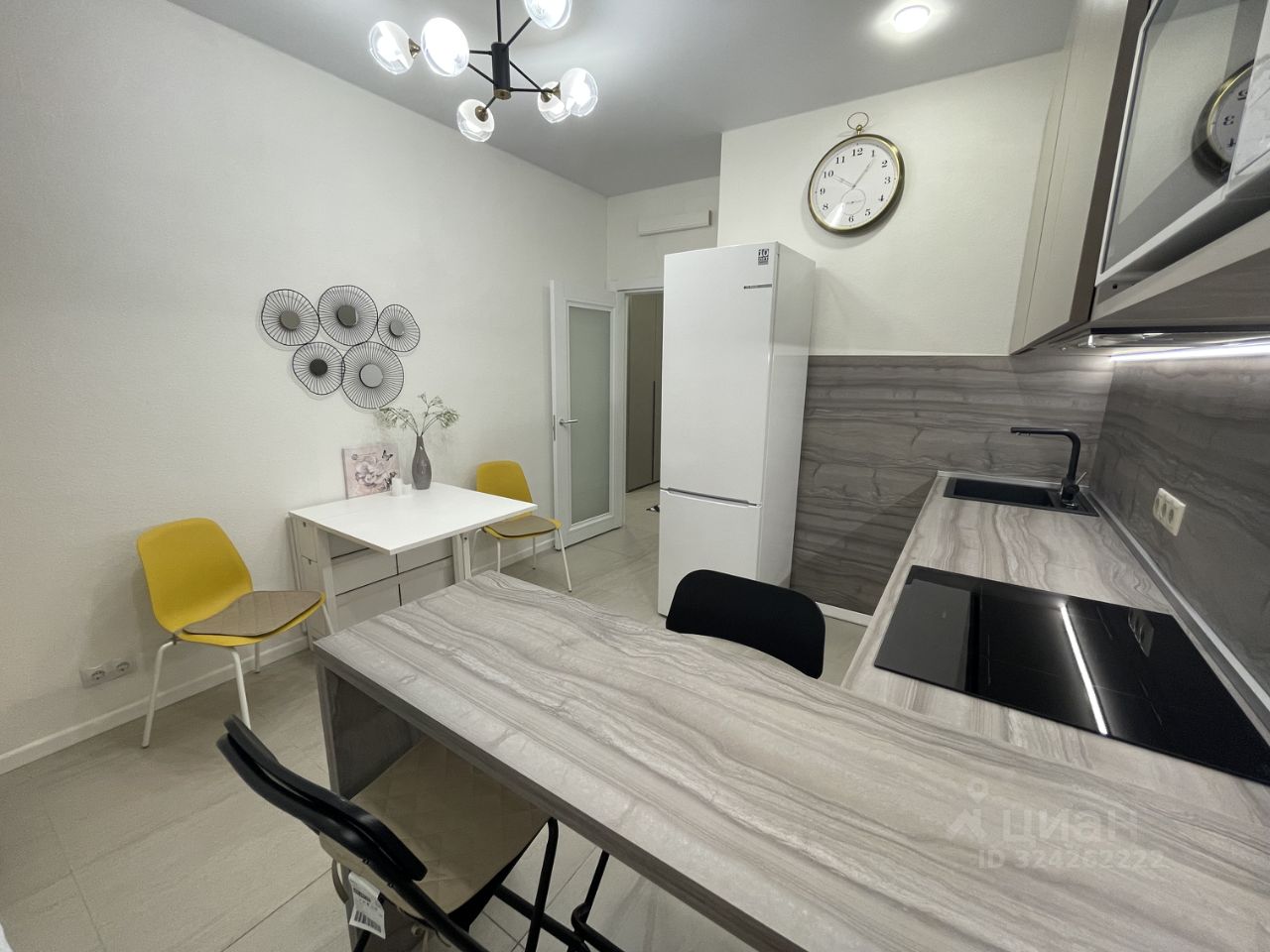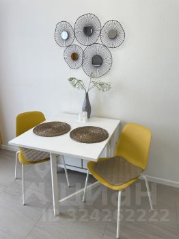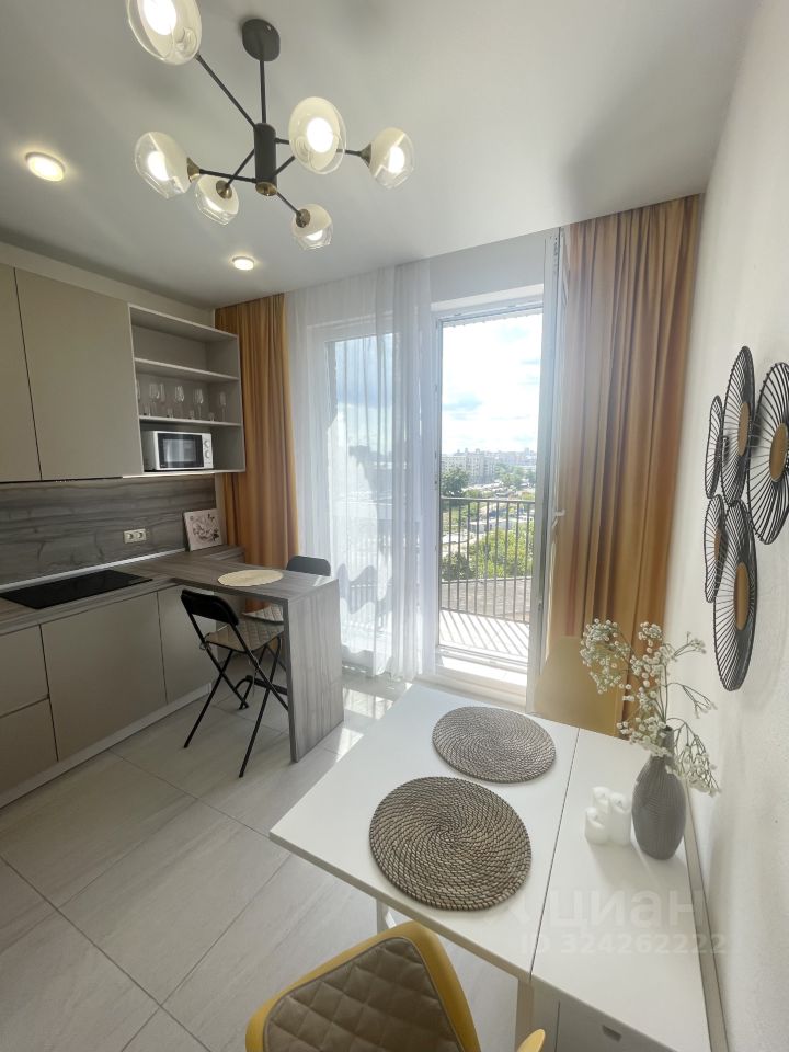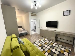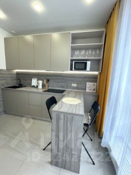 В квартире просторная светлая кухня с панорамными окнами в пол и открытым балконом, совмещенный санузел и комната с тремя зонами: для работы, отдыха и сна. Кухня укомплектована всей необходимой техникой немецкого бренда BOSCH: холодильник, варочная поверхность (индукция), вытяжка, микроволновая печь. В комнате имеется большая двуспальная кровать с подъемным механизмом (матрас ASKONA), раскладывающийся диван, рабочее место, комод, большой шкаф под одежду, телевизор, кондиционер, пылесос, утюг, гладильная доска. Ванная комната полностью в плитке, укомплектована сантехникой, стиральной машиной Bosch, зеркалом и полотенцесушителем. В коридоре установлен большой шкаф под одежду и обувь.
