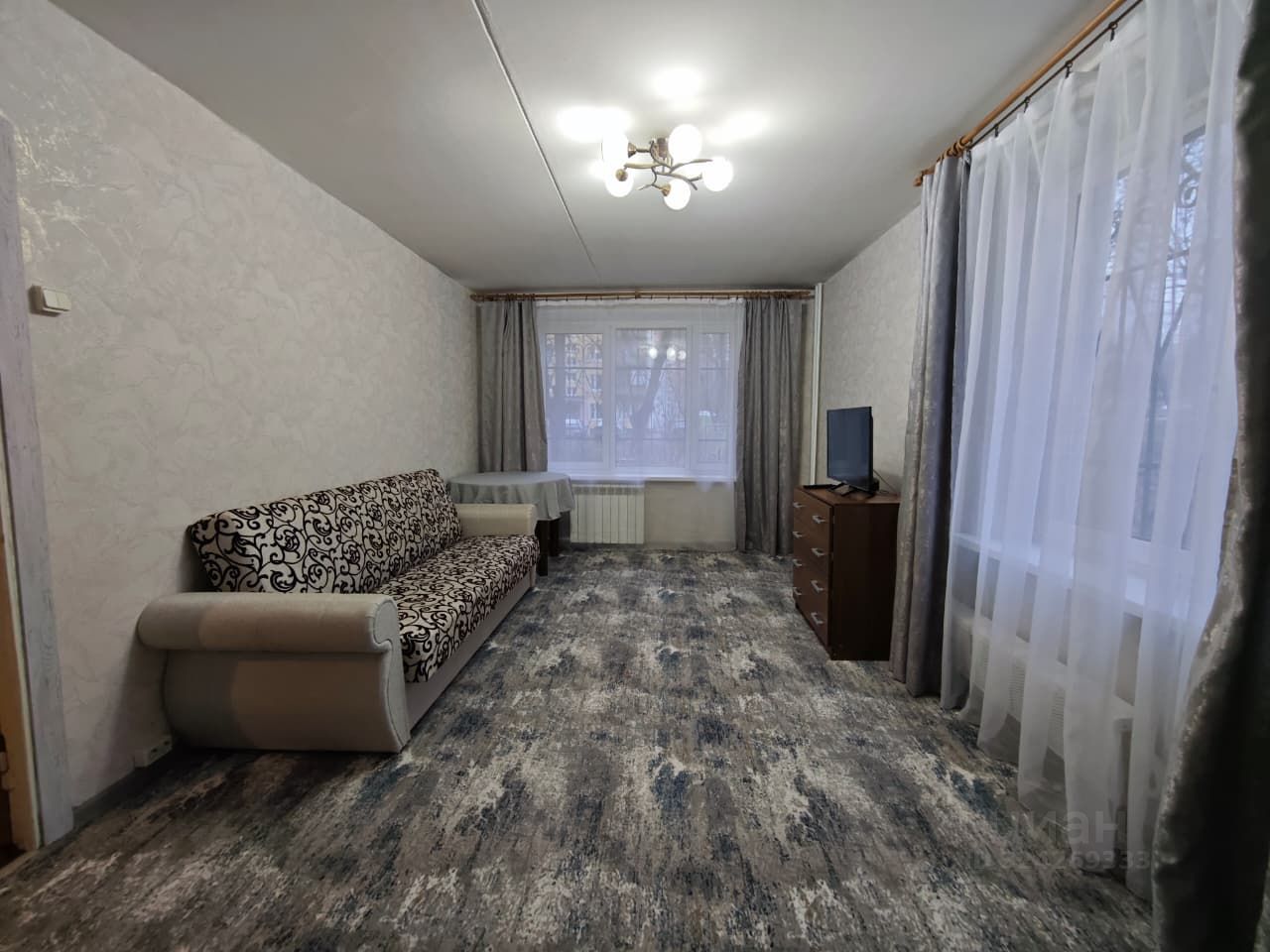 Комнaтa: шкаф, комод, стол, диван, телевизор, утюг.