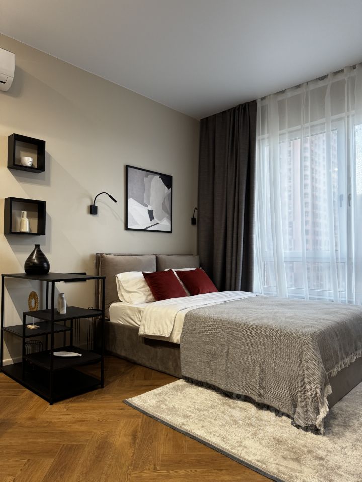 Каждая деталь продумана для вашего комфорта, есть все необходимое для проживания (двухспальная кровать с ортопедическим матрасом Аскона, постельное белье, подушки, одеяло, шторы блэкаут, телевизор 55 дюймов, интернет, посудомоечная машина, свч, индукционная варочная панель, вытяжка, пылесос, утюг, стиральная машина, полноценный встроенный холодильник, кондиционер, водонагреватель на случай отключения воды). Много мест хранения. Шкаф для хранения вещей, отдельный шкаф для хранения бытовых аксессуаров, кровать оснащена подъемным механизмом.