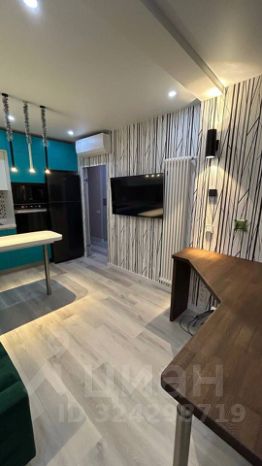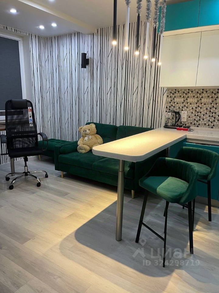 На кухне барная столешица, кресло для работы, большой рабочий стол, раскладной диван. LED-подсветка и другие светильники создают мягкое, уютное освещение в обоих помещениях.