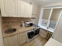 На кухне : кухонный совершенно новый гарнитур , встроенная стиральная машина автомат , новая , газовая плита с духовкой , свч , новая , обеденная группа ( стол обеденный который разбирается , мягкие табуреты ) , холодильник 2-х камерный , рулонные шторы на окне .