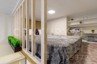 Общая площадь 19 кв. м. На первом уровне кухня совмещённая с гостиной, на втором уровне - спальня.