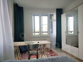 Две больших угловых светлых комнаты, полностью обставленных: кровать, платяной шкаф, стеллаж, большой рабочий стол. Вид на благоустроенный бульвар.