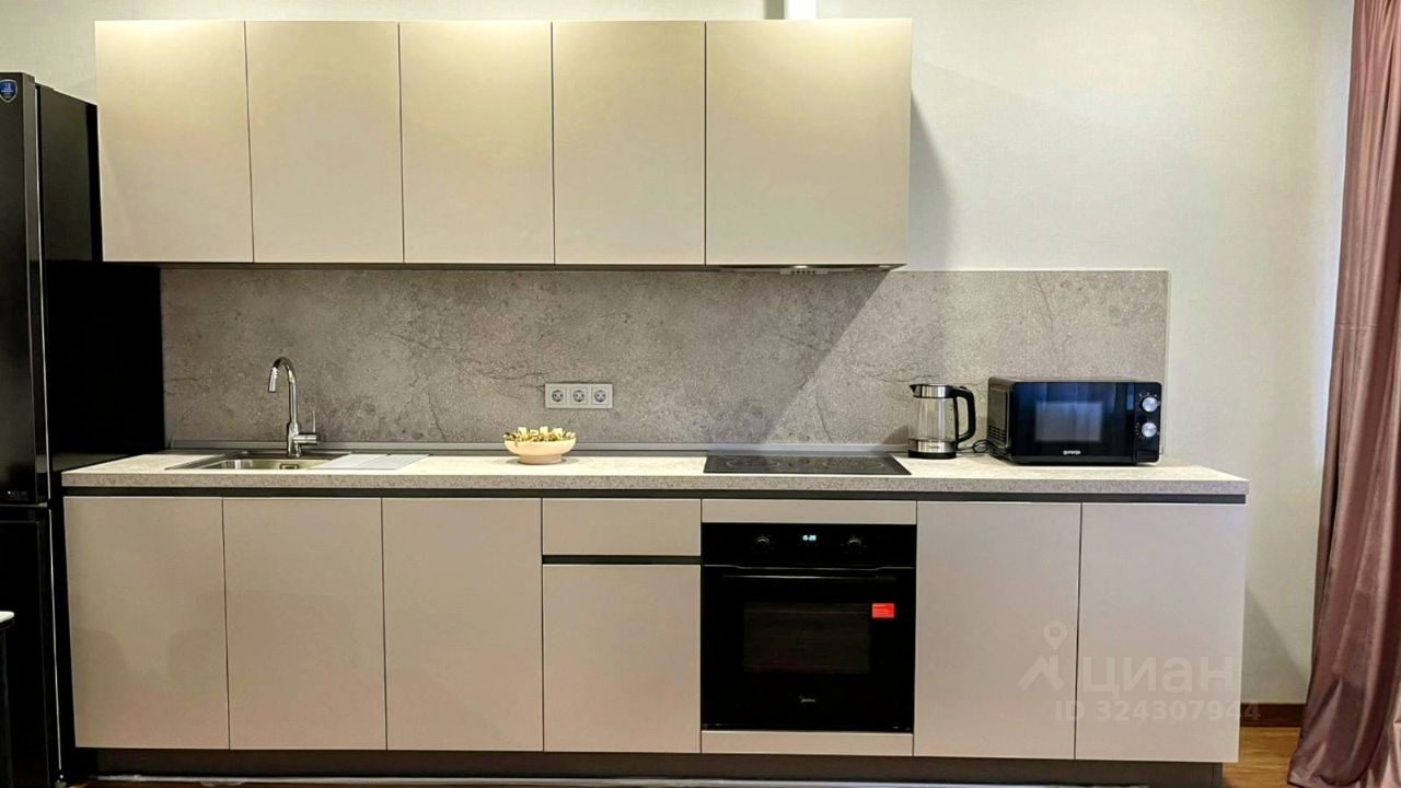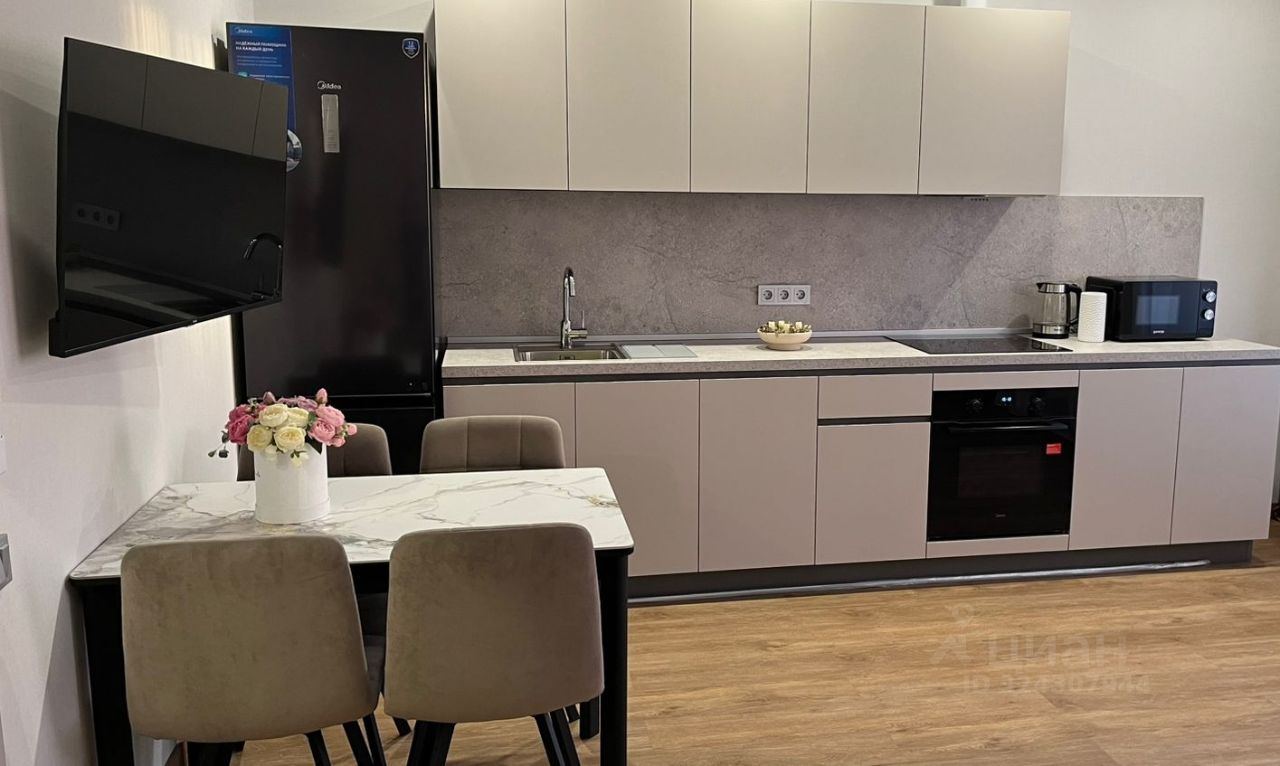 Есть всё необходимое для жизни. Кухня со встроенной техникой, посудомоечная машина, холодильник, варочная панель, духовой шкаф, СВЧ, стиральная машина, смарт ТВ, Wi-Fi.