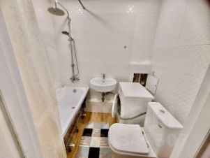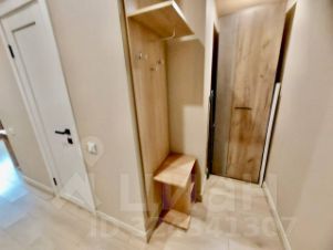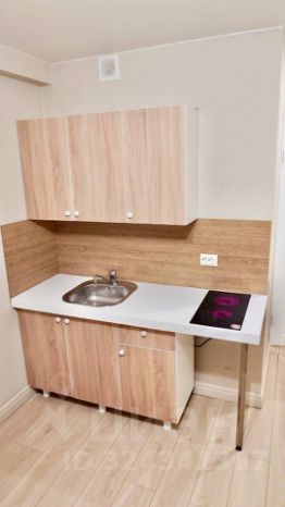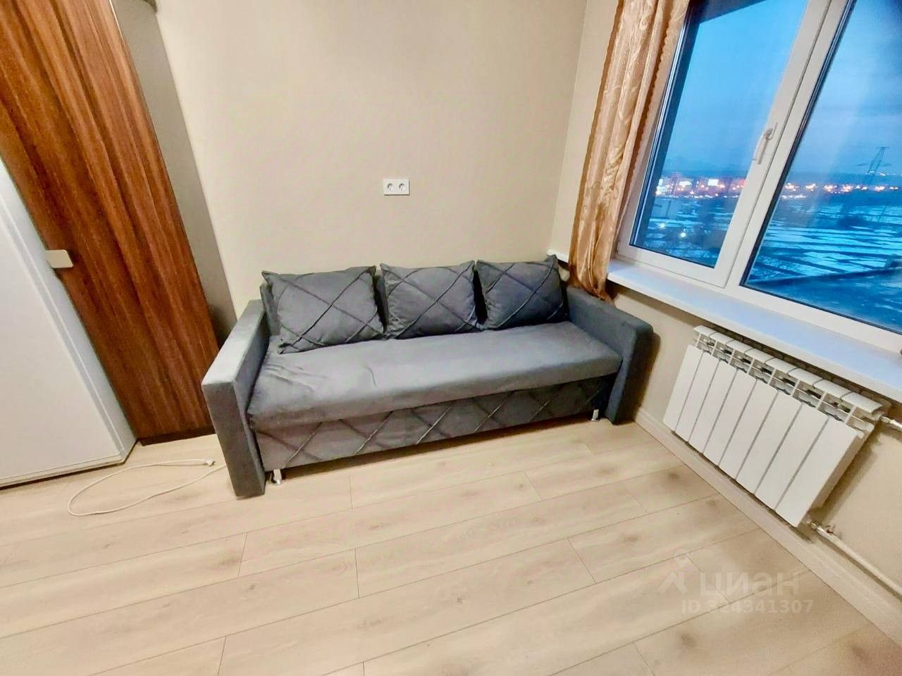 Студия на высоком 8 этаже. Спокойные природные оттенки отделки стен, холодильник, шкаф, диван, мини-кухня. Совмещенный санузел с ванной и стиральной машиной.