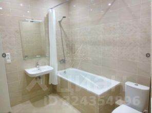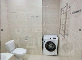 Большая ванная комната с качественной сантехникой, достаточно места для хранения бытовой химии и стиральной машины.