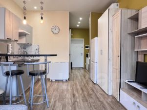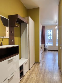 Квартира в отличном состоянии с множеством мест для хранения и хорошо зонирована. Кухонный гарнитур, холодильник, варочная панель и микроволновая печь, вытяжка, чайник, барная стойка. Удобный раскладывающийся диван и ортопедический матрас. Рабочая зона и ТВ. Установлен кондиционер.