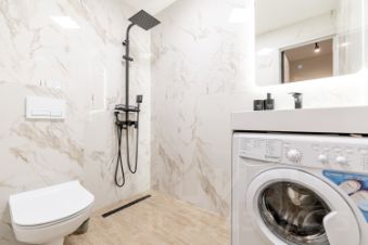 Чистая ванная комната с душевой кабиной