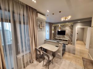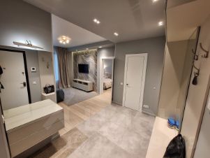 Квартира полностью укомплектована современной мебелью и техникой от ведущих производителей. В комнатах: двухспальная кровать, раскладной диван, ТВ. Система умный дом. ГАРДЕРОБНАЯ. Кондиционеры. Приточная система очистки воздуха. Подогрев полов. Вместительные шкафы. Качественная, дорогая сан техника. Кухонный гарнитур. Посудомоечная машина. Стиральная машина. Застекленная, утепленная лоджия. Видео домофон.