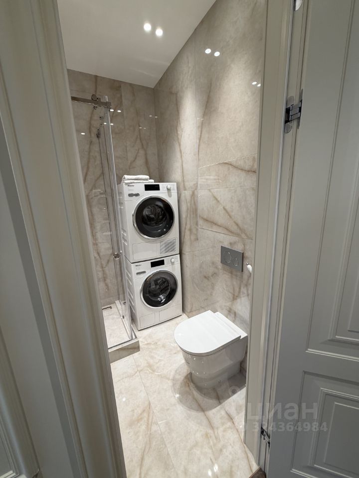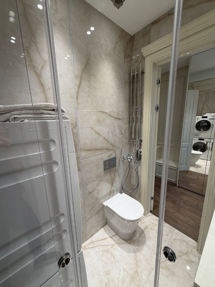 Внутри вас ждет тщательно продуманное пространство: жилая площадь составляет 40 кв. м, а кухня — впечатляющие 25 кв. м, что дает достаточно места для семейных обедов и приема гостей. В квартире есть все необходимое для комфортной жизни: кондиционер, холодильник, посудомоечная и стиральная машины, телевизор. На кухне и в комнатах есть мебель, а два совмещенных санузла оснащены как ванной, так и душевой кабиной.