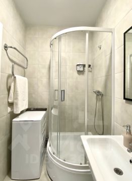 Совмещённый, с современной душевой кабиной и стиральной машиной с вертикальной загрузкой.