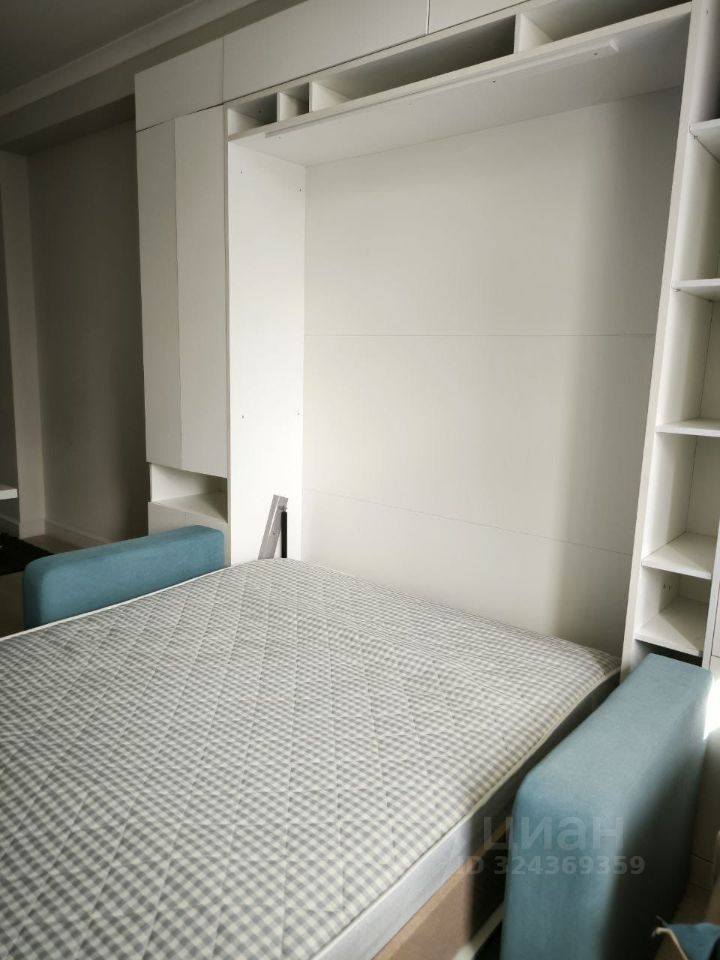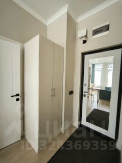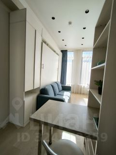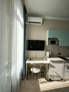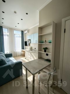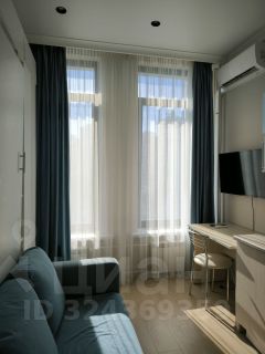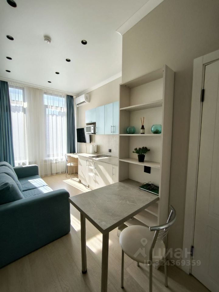 Студия выполнена в современном стиле, с высокими потолками и большими панорамными окнами.
