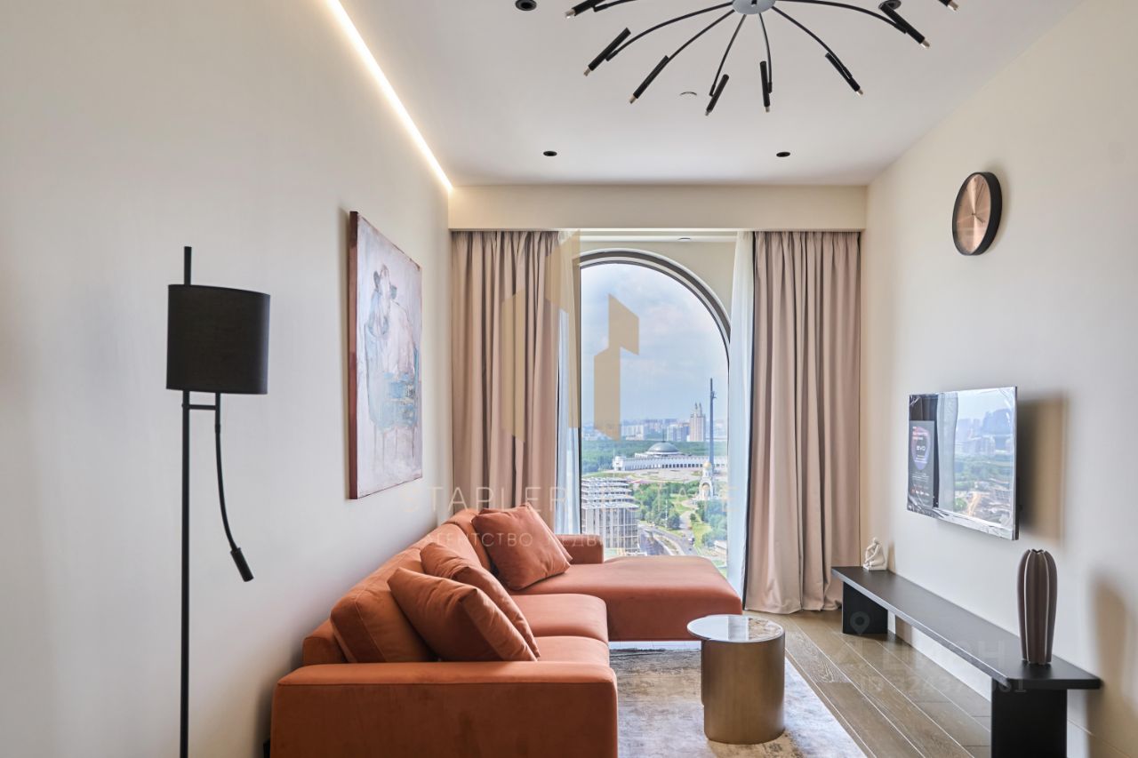 Апартаменты общей площадью 62.8 м расположены на 28-м этаже. Выполнена премиальная отделка от застройщика в стиле вне времени с использованием высококачественных материалов. Спланирована просторная кухня-гостиная, спальня с гардеробом, ванная комната, холл. Арочные окна придают особый шарм данному апартаменту. Благодаря панорамному остеклению пространство наполнено естественным светом, открываются живописные виды на город и на Кутузовский проспект.