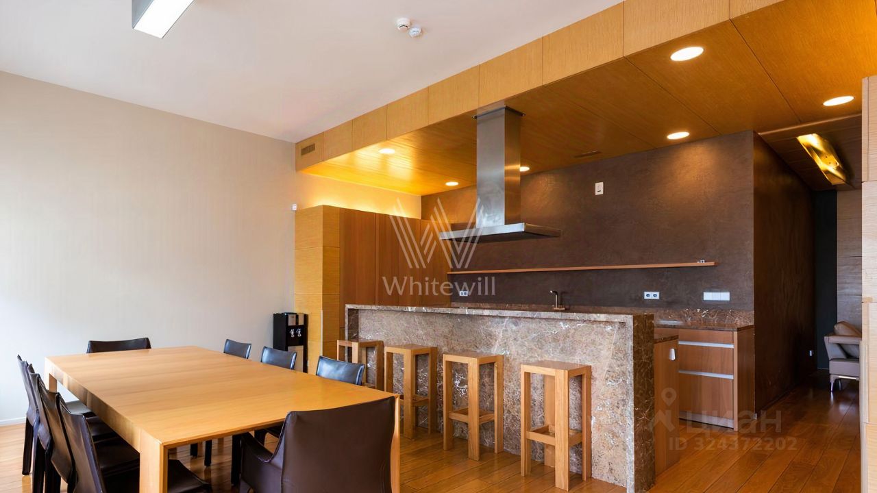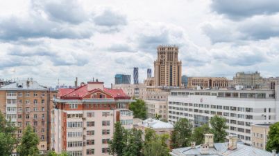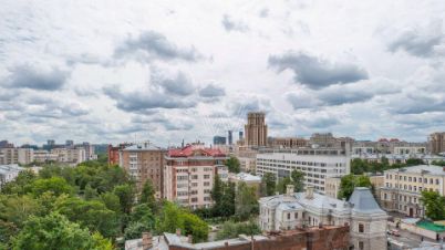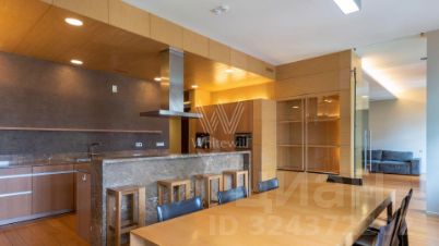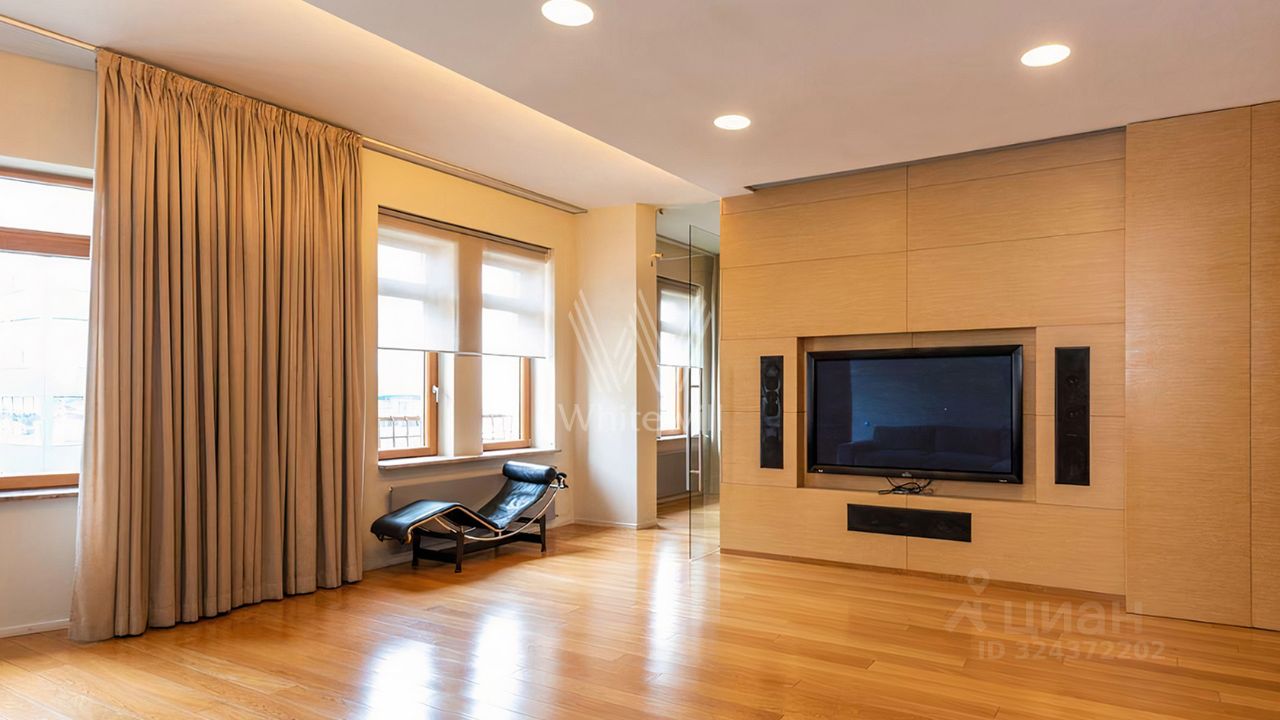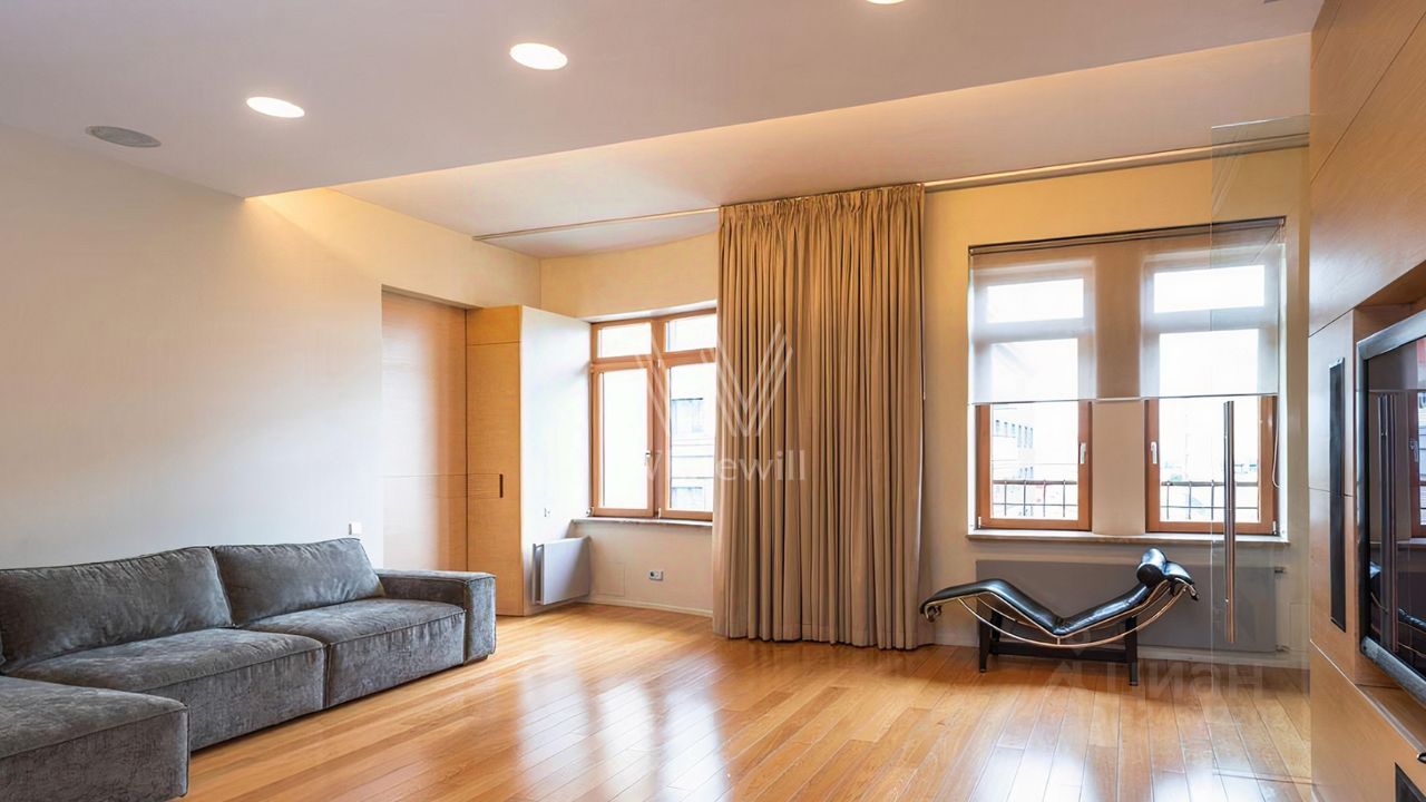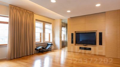 Просторная квартира площадью 286 м² в комплексе "Бахрушина, 13" на 9 этаже. Выполнен дизайнерский ремонт с использованием натурального дерева. На полу выложена паркетная доска и крупный керамогранит. Интерьер выдержан в приятных кремово-бежевых тонах, стены украшены картинами.