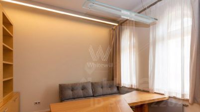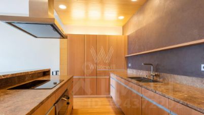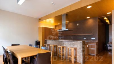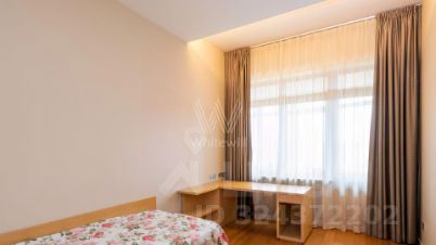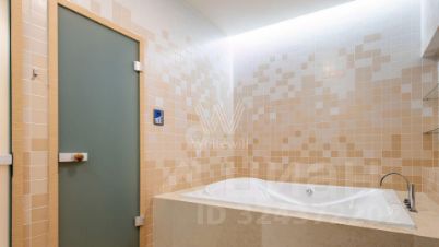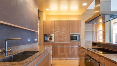 Квартира полностью меблирована, в гостиной обустроена зона отдыха с камином и домашним кинотеатром. Кухня со встроенной бытовой техникой отделана натуральным камнем. В одной из ванных комнат спланирована сауна, санузлы отделаны керамогранитом.