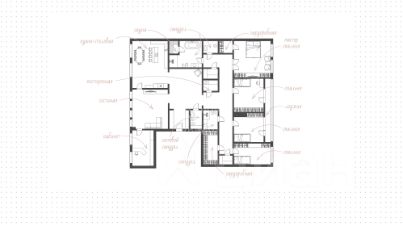 Планировка: кухня-гостиная, гостиная, 4 спальни, кабинет, 4 санузла, 2 гардеробные, подсобные помещения, холл. Из двух спален предусмотрен выход на общую лоджию. Окна ориентированы на две стороны света.