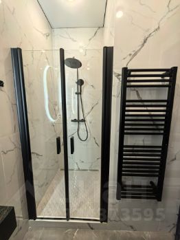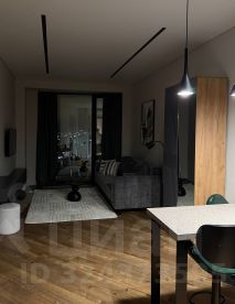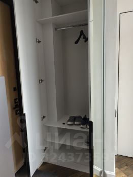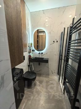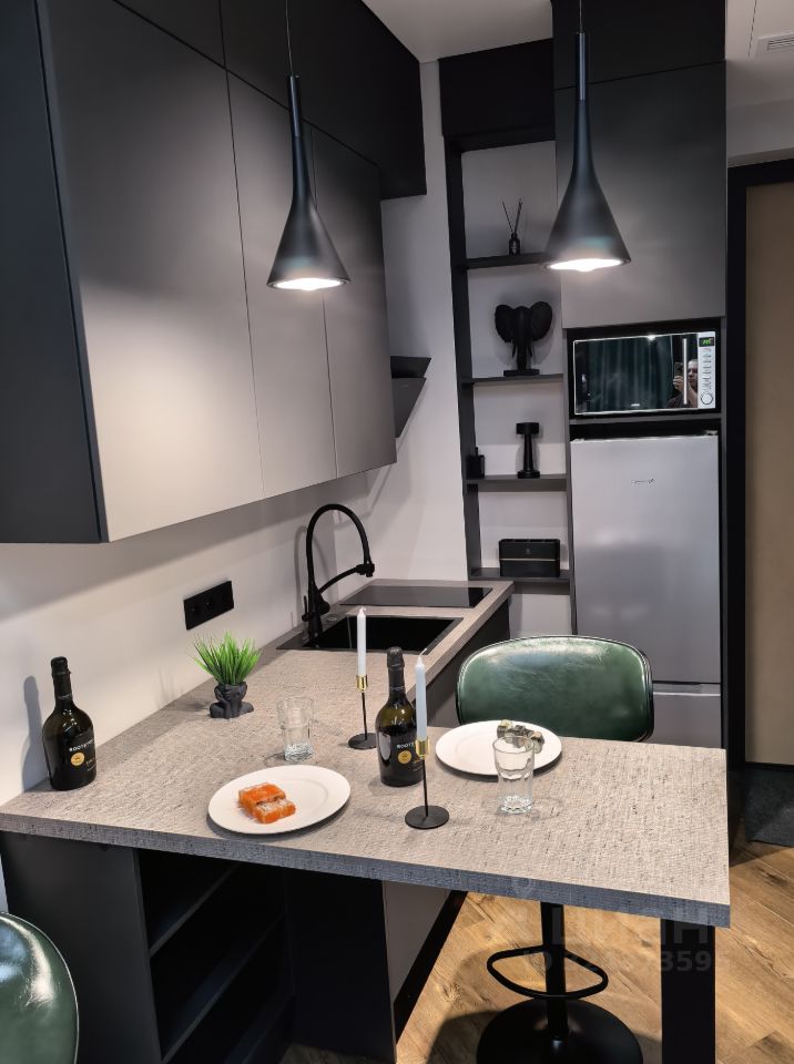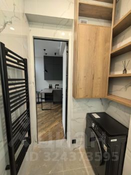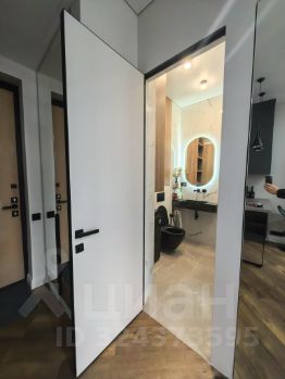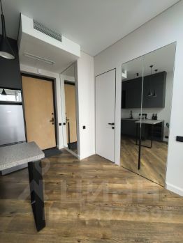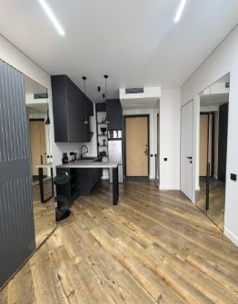 Студия с дизайнерским ремонтом из премиальных материалов эргономически вывереная по полезности пространства и площади: большая гостиная и кухня 23 кв м, 2 встроенных скрытых зеркальных шкафа (гардеробная и прихожая) по 0,7 кв м каждый, санузел с душевой 4 кв м.