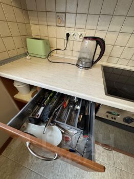 Кухонный гарнитур со встроенной бытовой техникой (варочная панель и духовой шкаф Ardo, посудомоечная машина ), холодильник и свч, тостер, чайник. имеется необходимая посуда и столовые приборы. Есть новая широкая гладильная доска и утюг.
