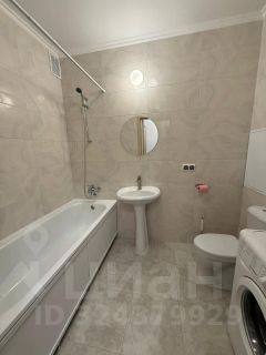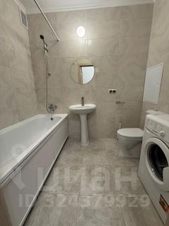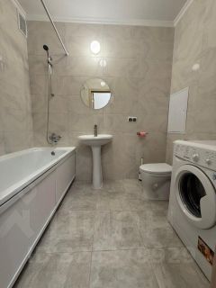 • Ванная комната в светлых тонах, оборудована ванной, стиральной машиной и современной сантехникой