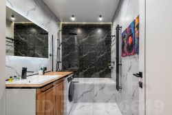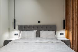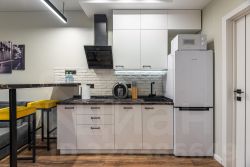 В апартаментах есть большая двуспальная кровать, диван, обеденная зона и полностью оборудованная кухня с варочной панелью, микроволновкой, холодильником и необходимой посудой. Просторный санузел выполнен в премиальной отделке: ванна, душевая зона с верхним душем, стиральная машина, фен и косметические наборы Flat Inn.