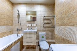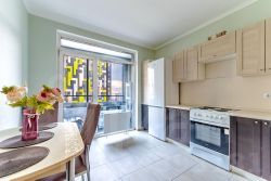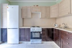Квартира меблирована (кухонный гарнитур, мягкая мебель, и различные места хранения) и оборудована бытовой техникой: холодильник, плита, стиральная машина.