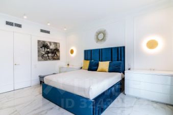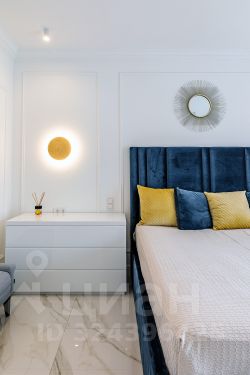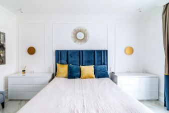 В СПАЛЬНЕ: шикарная 2-х спальная кровать, в благородно-синей бархатной обивке, с ортопедическим матрасом + 2 белоснежных прикроватных комода.
