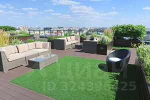 Для жильцов на крыше жилого комплекса расположена зона отдыха, с живыми растениями, креслами и диванчиками.