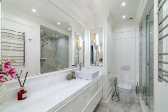 2 раздельных санузла, один из них гостевой, с небольшой раковиной, второй с большой душевой, унитазом, гигиеническим душем и т.д.