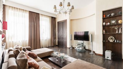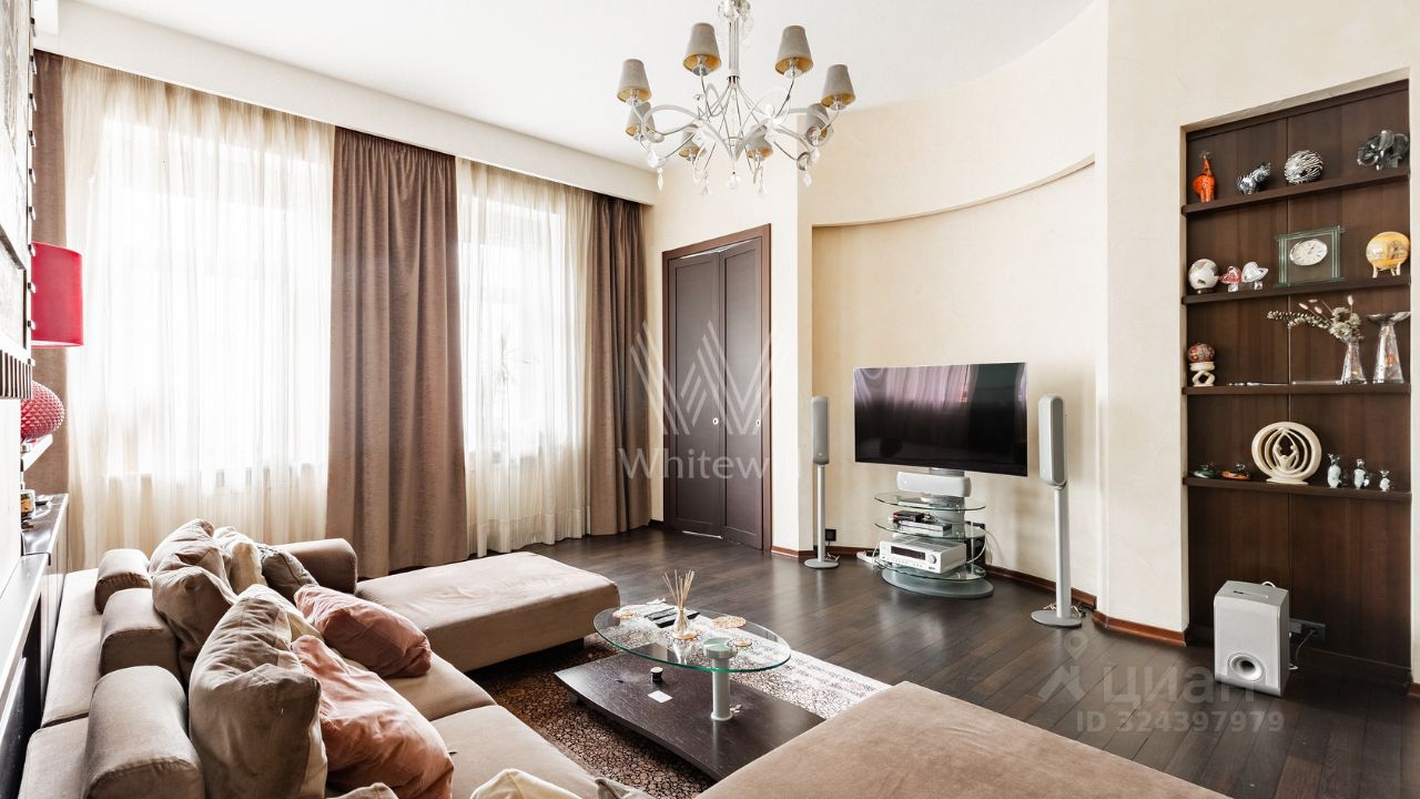 Квартира с 2 спальнями общей площадью 130 м² расположена на 5 этаже дома на Новом Арбате. Интерьер оформлен в современном стиле с светлых тонах, контрастные акценты в тёмно-шоколадных и красных оттенках придают пространству глубину и выразительность. На полу выложен паркет Венге, установлены мраморные подоконники, итальянские двери и плитка, мебель из ангарской сосны. Благодаря большому количеству окон и потолкам высотой 4 метра квартира наполнена естественным светом и воздухом.