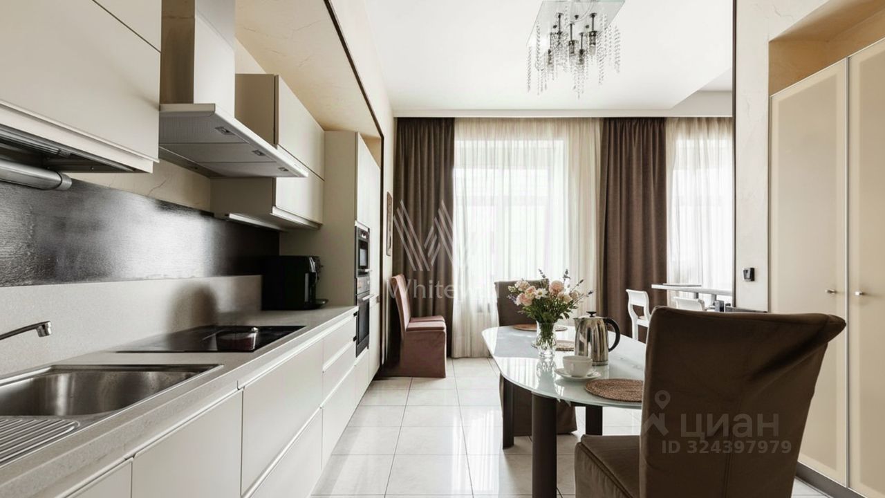 Спланирована кухня-гостиная с обеденной зоной, мастер-спальня с ванной комнатой с окном, кабинет, гардеробная, гостевой санузел, прихожая, 2 балкона. Квартира полностью меблирована и оборудована бытовой техникой Kuppersbusch и Bosch, санузлы оснащены сантехникой Villeroy & Boch. Установлены системы центральной очистки воздуха и воды, центральная система кондиционирования. Из окон открываются виды на улицу и в тихий двор. Предусмотрено машино-место во дворе комплекса.