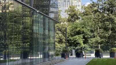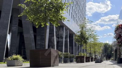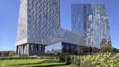 Главное о доме. "Дом на Мосфильмовской" — две башни высотой 33 и 53 этажа, созданные по проекту Сергея Скуратова. Контраст светлых и тёмных фасадов подчёркивает динамику силуэта, а башни соединены семиэтажной галереей. Входные группы с потолками 7 метров отделаны мрамором и тропическими растениями, лобби работают как просторные гостиные с консьерж-сервисом. Во дворе высажены липы, разбиты цветники и спортивные площадки, проложены дорожки из гранита. Для жителей предусмотрены детские зоны, кафе и трёхуровневый подземный паркинг с автомойкой.