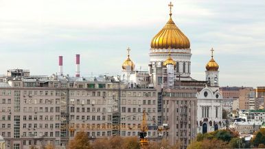 Красивый вид из окон на Храм Христа Спасителя, Колокольню и Храм Софии Премудрости Божией, Кремлевские башни, Сити.