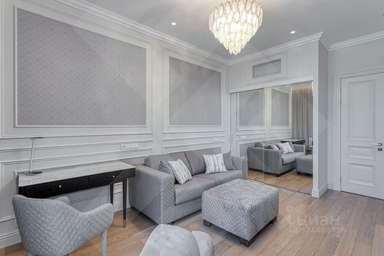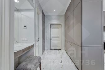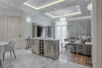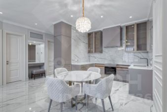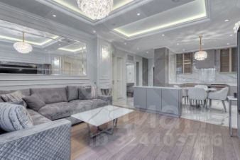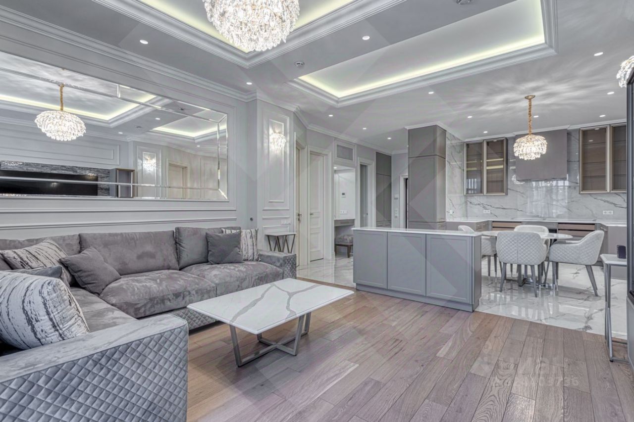 Планировка апартамента: гостиная-кухня, спальня с гардеробной и санузлом (ванна и душевая); кабинет (или еще одна спальня) с санузлом. Выполнен дизайнерский ремонт ремонт. Центральная система кондиционирования, полы с подогревом. Бытовая техника от ведущих мировых производителей стиральная машина с сушкой, индукционная варочная панель, телевизор 85 дюймов, домашний кинотеатр, и прочее. Машино-место в подземном паркинге.