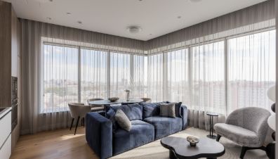 Синий бархатный диван в гостиной — как кусок черничного пирога после долгой прогулки: маленький праздник, который ждёт вас каждый вечер. Кресла из буклированной ткани добавляют мягкости и фактуры. Низкий кофейный стол напоминает тень от облака, проплывающего за угловыми окнами.