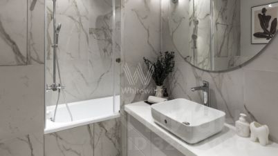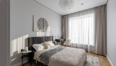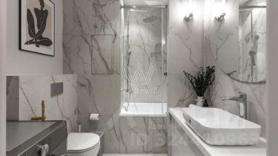 Спальня в светло-серых тонах — укромная и тихая. Закрываете плотные шторы — и мегаполис на паузе. Ванная в белом мраморе — ещё один уголок тишины, чтобы стереть заботы дня.